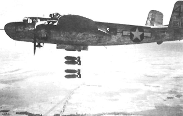 The B-25H Bones dropping bombs (1,000-pound) over northern Italy in 1944. Bones was part of the U.S. 82nd Bombardment Group, 12th Air Force. (O)