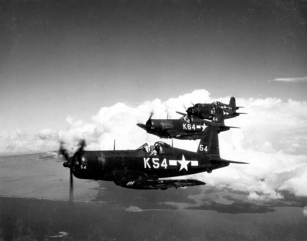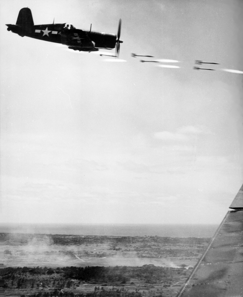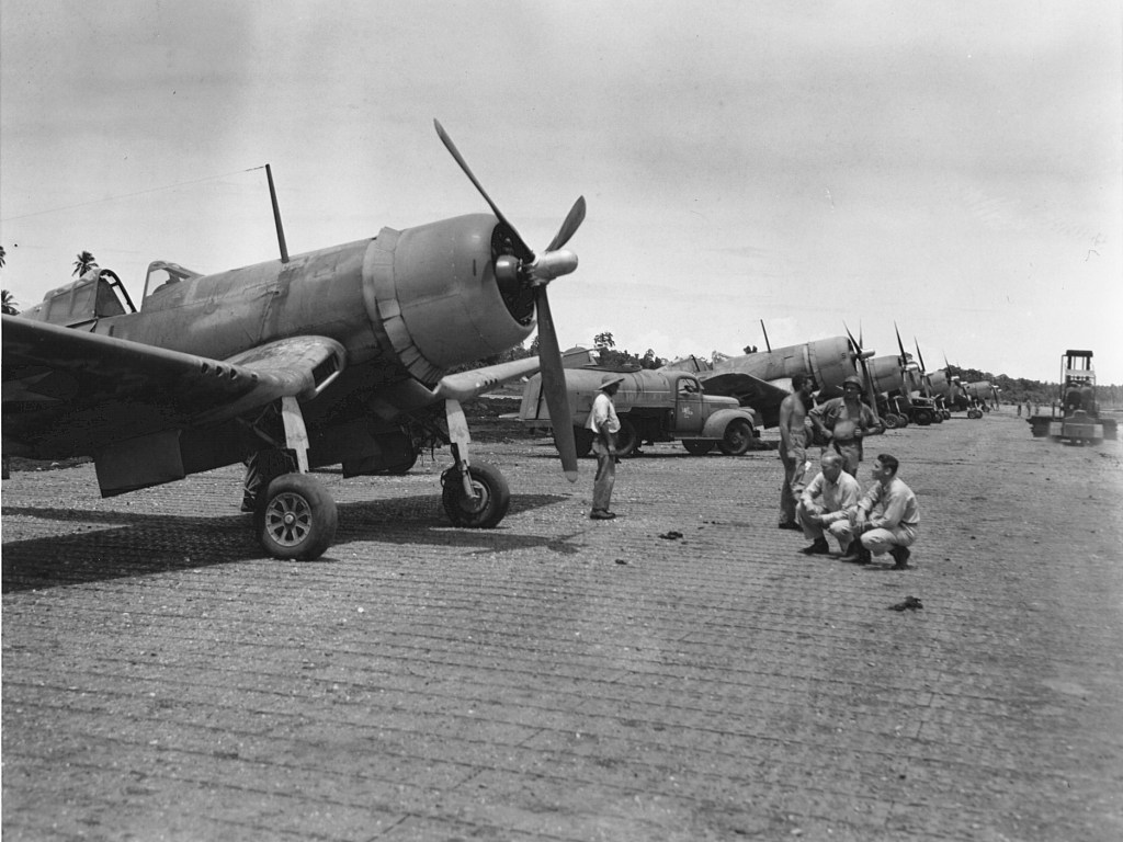 The Navy is also recorded as using the F4U in early October 1943 strafing the Japanese airfield on Bougainville Island, as well as strafing barges, transport ships, and military installations on and around the Solomon Islands and New Britain. In February 1944, Navy F4U’s targeted a Japanese air field on the eastern part of New Britain (Vunakanau). Naval F4U missions also included those in the Marshall and Marianas islands.